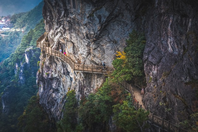 踏上南清园的栈道,山风便裹着松涛声扑面而来。“这栈道修在海拔 1600 米的崖壁上,脚下就是百米深谷,” 玄诚指着前方的奇峰,“那尊直立的花岗岩就是‘巨蟒出山’,有 128 米高,是三亿年前的火山喷发形成的。” 栈道旁的松树贴着崖壁生长,枝干虬曲,玄诚说这是 “迎客松”,在三清山生长了上千年,“松针能入药,以前道长们常采来泡茶。”
