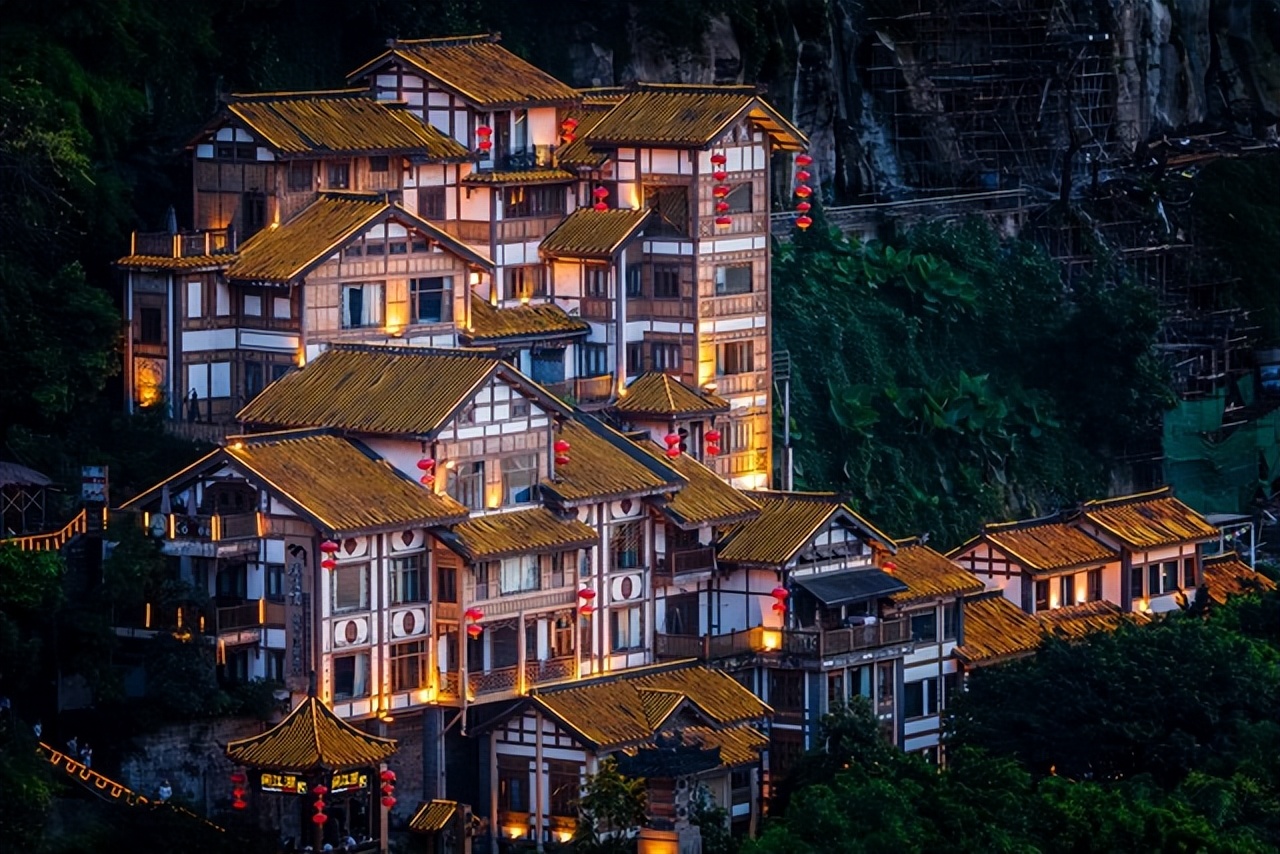 傍晚六点的嘉陵江畔,洪崖洞的灯火刚次第亮起。我站在千厮门大桥上远眺,依山而建的吊脚楼群像从江面生长出来的奇幻城堡,木质结构的飞檐在灯光下泛着暖黄的光,层层叠叠的楼阁间挂着红灯笼,江水倒映着灯火,分不清是楼在水中,还是水在楼间。这座以重庆传统吊脚楼为原型的建筑群,没有刻意复刻古迹的生硬,反而将老重庆的烟火气藏进了每一道木缝里。